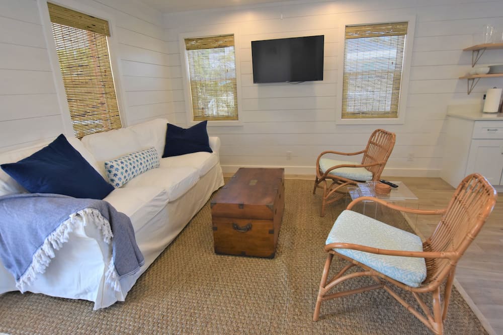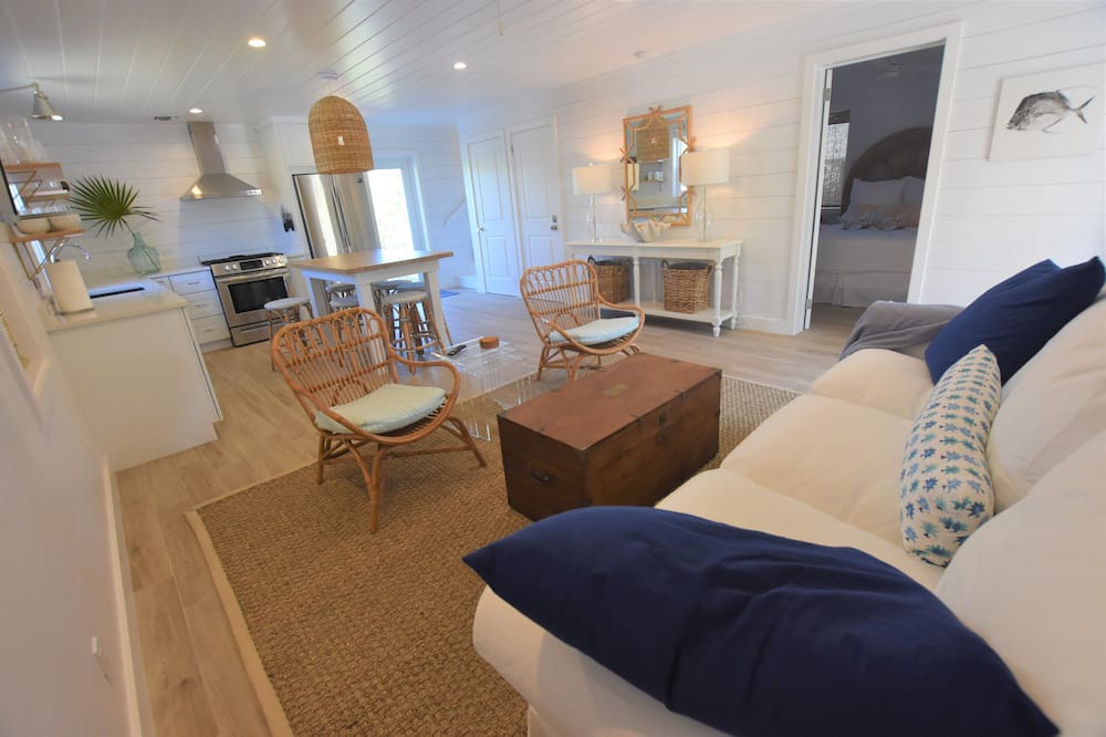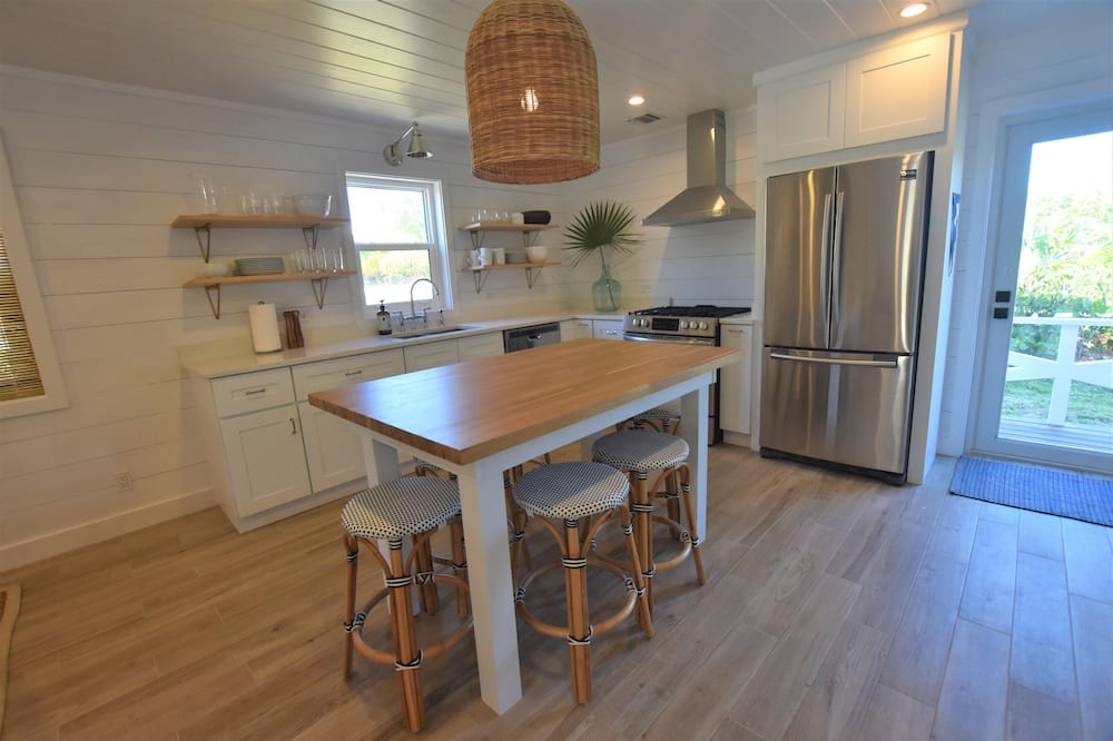 Step into Coconut Row, where coastal elegance meets meticulous attention to detail. The house is perched 5' above ground, offering a front porch that beckons for relaxation and moments of serenity as you soak in the ocean breeze. The interior boasts ship lap walls, porcelain tile, and an open-concept kitchen and living room designed for effortless entertaining.