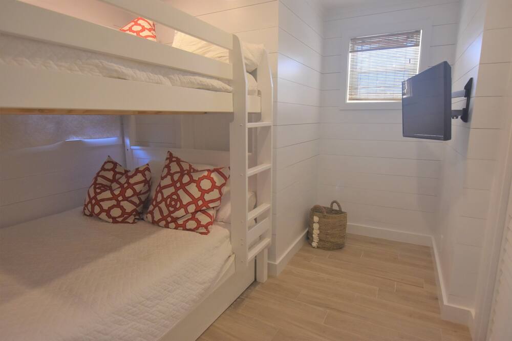 The master bedroom, located downstairs, features a spacious queen-sized bed, ensuite bathroom, and a closet. Upstairs, two additional bedrooms await—one with a queen bed and the other with a full-over-full bunk bed and an additional twin trundle, ideal for families or groups. The shared upstairs bathroom offers a double vanity and a walk-in shower.
