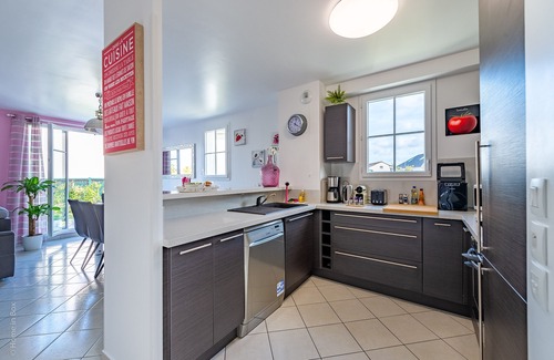 On the right, the fully-equipped open-plan kitchen awaits the most discerning gourmets. Induction hob, extractor fan, fan-assisted oven, microwave, dishwasher, fridge, freezer, coffee maker, kettle, toaster, Nespresso machine, ice maker, blender, juicer... not to mention all the cookware and crockery, including champagne flutes! Everything has been thought of so that you'll want for nothing.