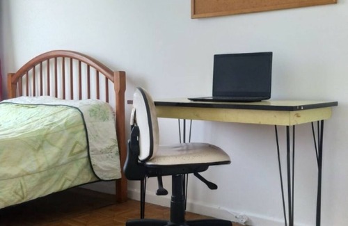 Quarto com cama de casal e um pequeno escritório para trabalhar.