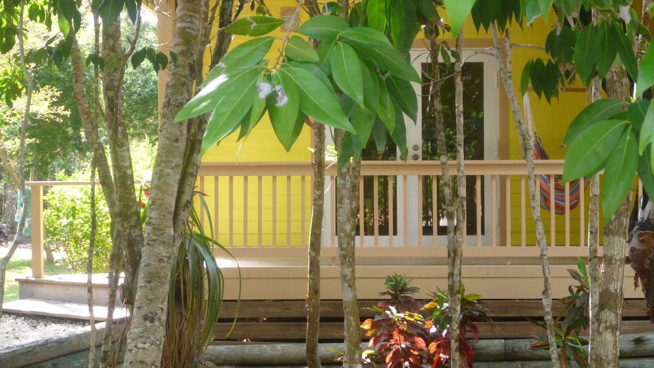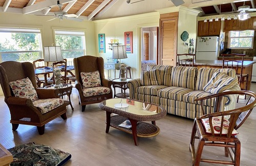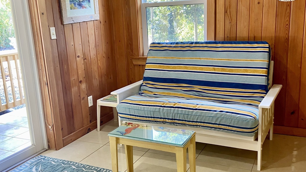 'Banana Split' has spacious bedroom, bath, closets, a small kitchen and dining/lounging area with futon. TV, Wi-Fi, DVD, full refrigerator, cozy front porch.