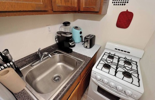 Welcome to your stylish retreat in the heart of New York City! Ideal for two guests, our cozy suite features wood floors, tasteful decor, and charming exposed brick walls. Located near Central Park and Times Square, you'll enjoy easy access to top attractions, dining, and museums. The suite includes a work desk, TV, air conditioning, and high-speed WiFi for your comfort. Explore Central Park, catch a Broadway show, or visit renowned museums. Dine at Jean-Georges, Carbone, or grab pizza at Joe's!