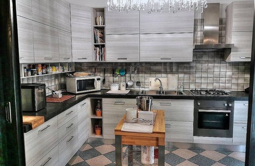 You will be able to enter the kitchen from the first living room through a large sliding door. It is equipped with a four-burner gas cooker, a gas oven, a refrigerator with freezer, a dishwasher, a microwave oven, an Italian-style coffee-maker, an American-style coffee-maker (bring your filters!) and a kettle. From the kitchen a French door will take you to the patio.
